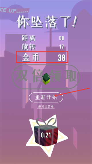 4、坠落结算时确认【金币-38】收益,可选择【重新开始】继续挑战,或通过【双倍领取】获取更多资源,同时留意礼物倒计时。