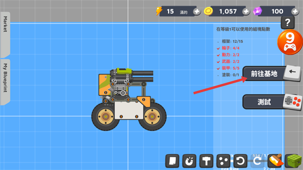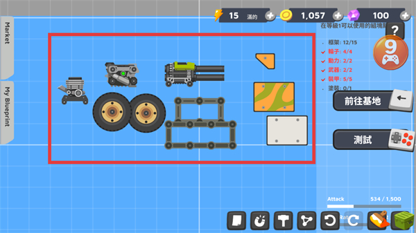 1、在造车界面,使用红色框内的发动机、轮子、武器等部件,组装自己的战车。