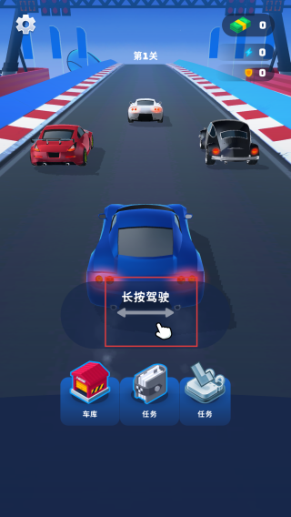 1、根据提示长按对应区域驾驶车辆,开启赛道挑战。