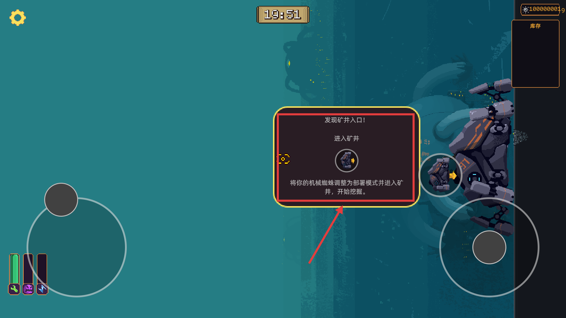 2、发现【矿井入口】后点击进入,调整机械蜘蛛为部署模式,开始挖掘矿脉获取资源,注意洞穴怪物。