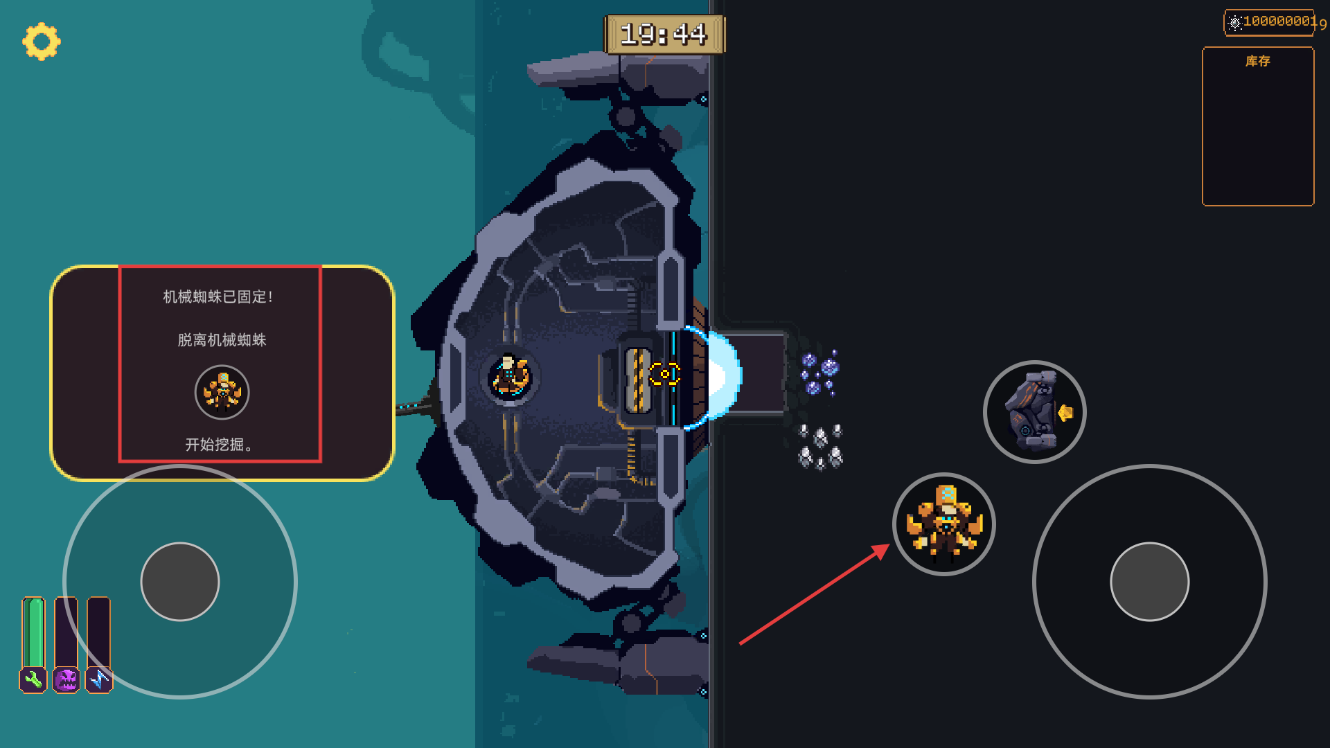 3、机械蜘蛛固定后脱离,使用工具挖掘岩石,收集掉落资源并在蜘蛛上卸货,推进探索进度。