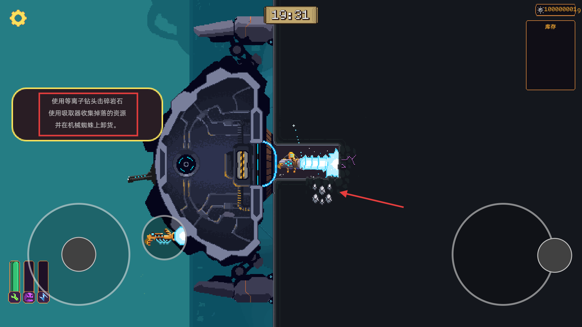 4、使用【等离子钻头】击碎岩石,用【吸取器】收集资源,在机械蜘蛛上卸货,积累资源提升科技等级。