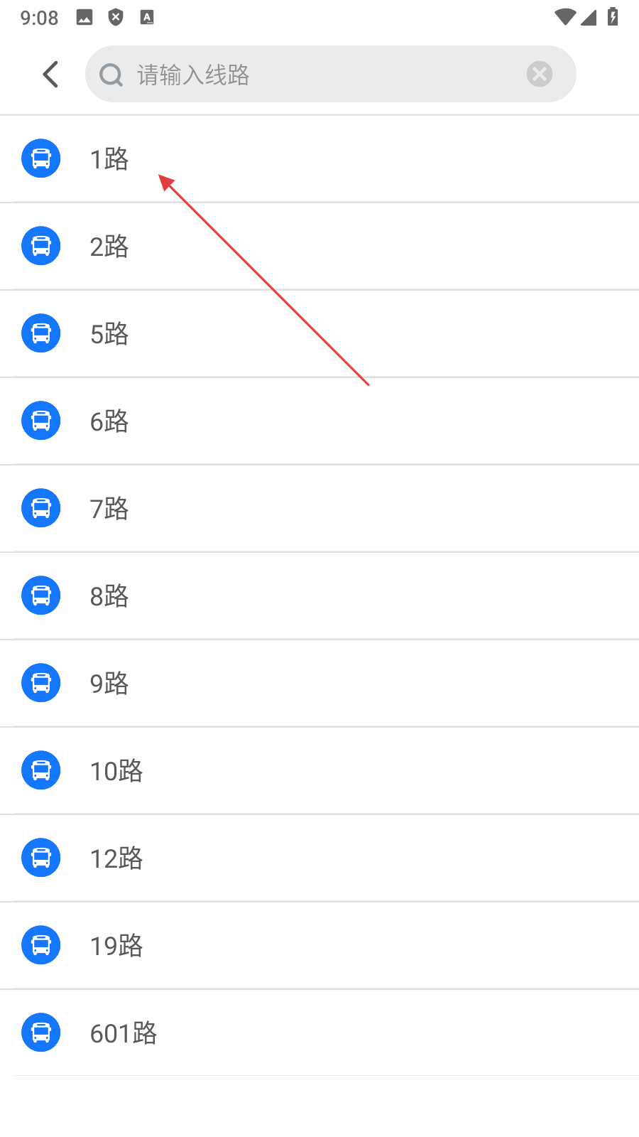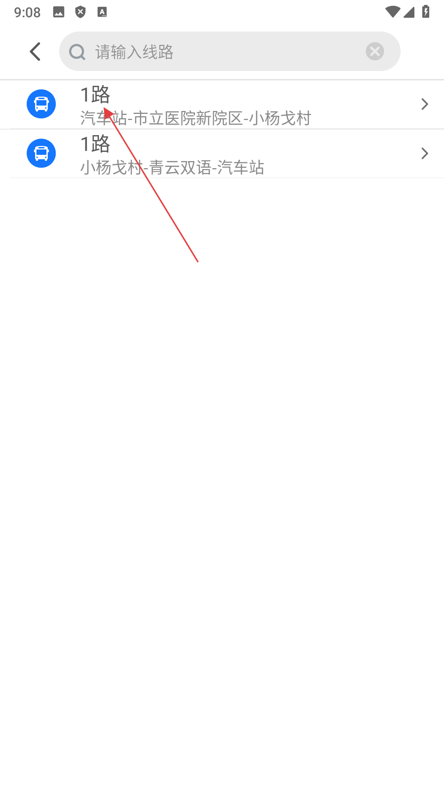 2、在线路选择页面,点击【1路】,进入1路公交的双向线路选择页面。