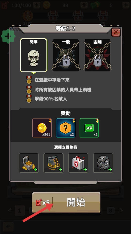 1、选择关卡等级的简单难度,点击【开始】,进入关卡。