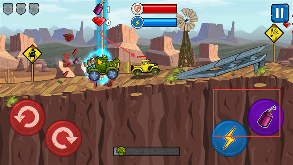 3、遇到敌人车辆(如黄色吉普车)时,使用攻击道具(如闪电)消灭敌人,获取资源。