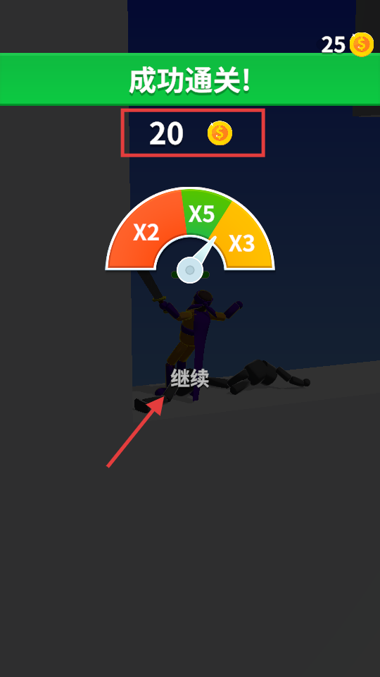 3、通关后可获得【20金币】奖励,点击【继续】按钮进入下一关,还能触发倍数奖励机制。