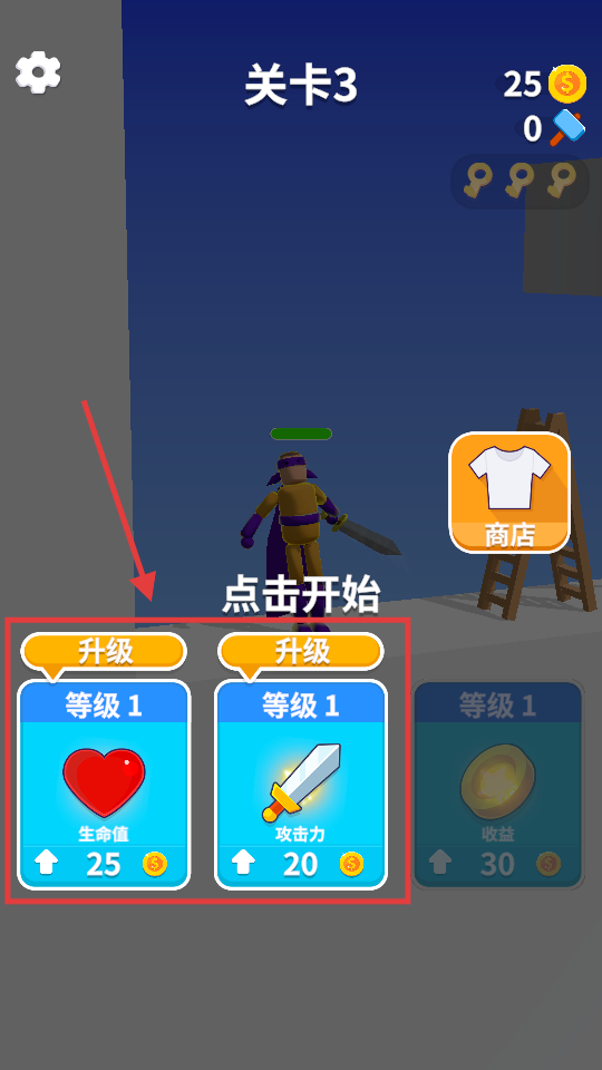 4、进入【关卡3】前,消耗金币升级【生命值-等级1】或【攻击力-等级1】,提升战斗属性。