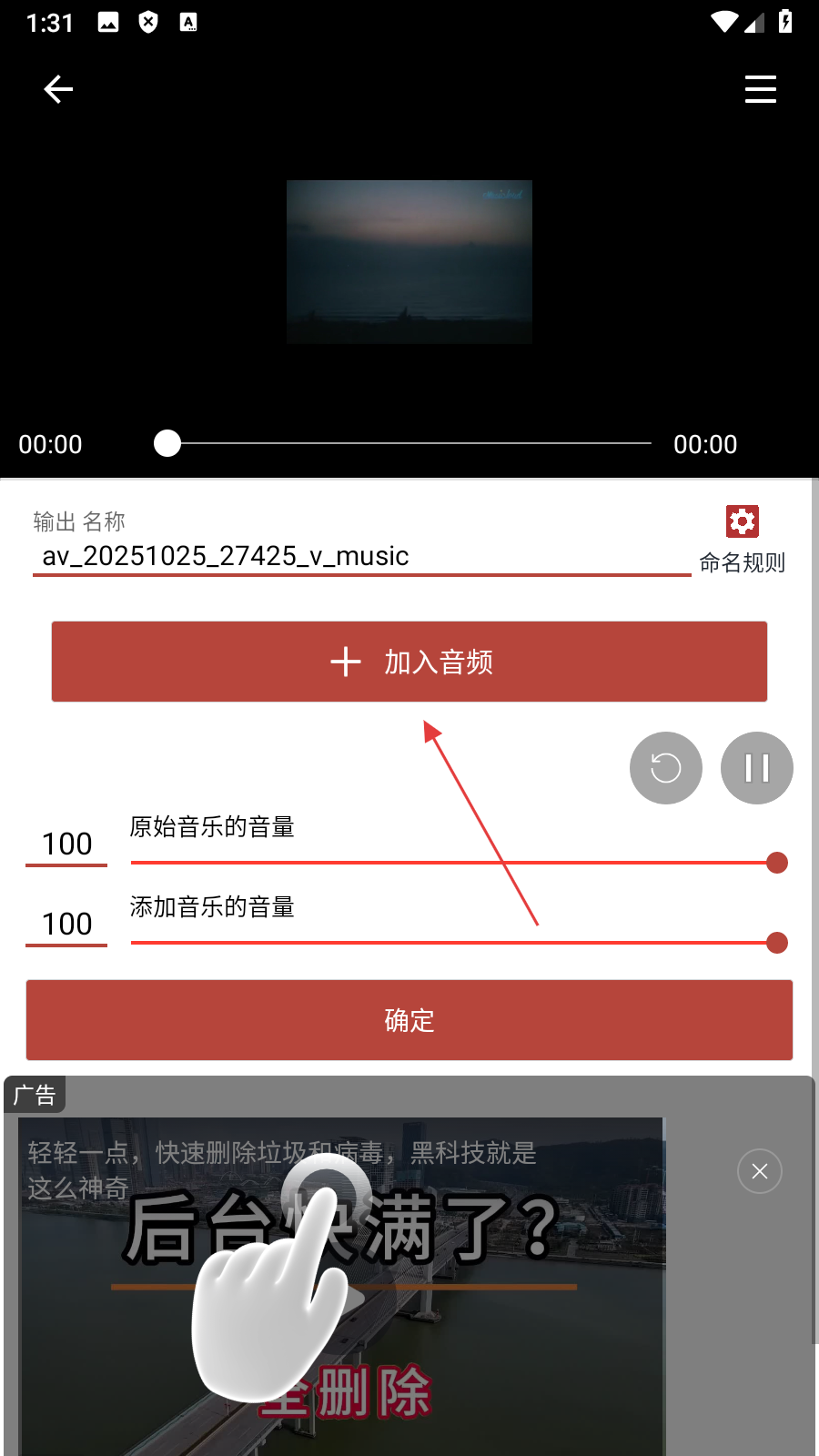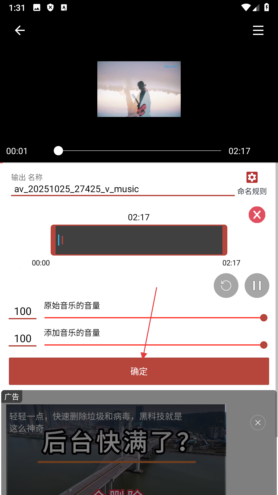 4、添加背景音后,点击【确定】,即可完成视频背景音添加操作。