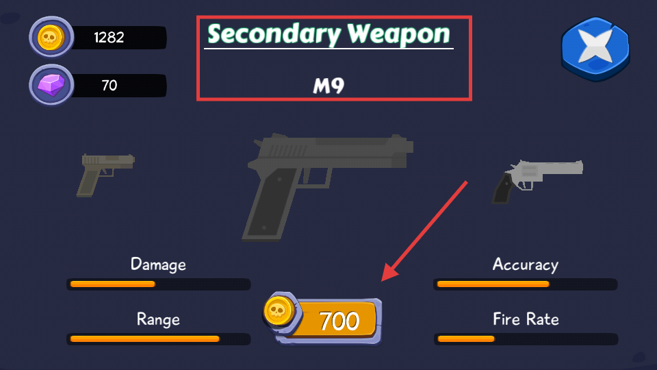1、升级【SecondaryWeapon-M9】副武器需消耗【700】金币,提升其【Damage-Range-Accuracy-FireRate】属性增强战斗能力。