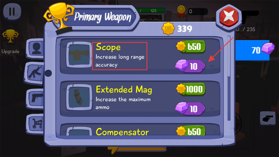 3、为【PrimaryWeapon】主武器解锁【Scope】配件,消耗【650】金币与【10】紫钻提升远程精准度。