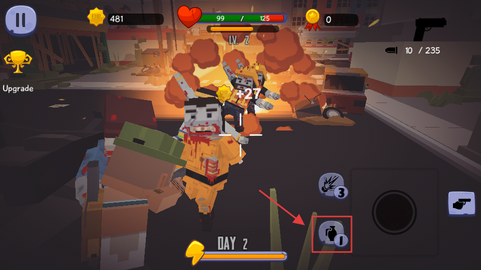 4、战斗时使用界面下方的【燃烧瓶】道具,对密集僵尸造成范围伤害并获取额外金币奖励。