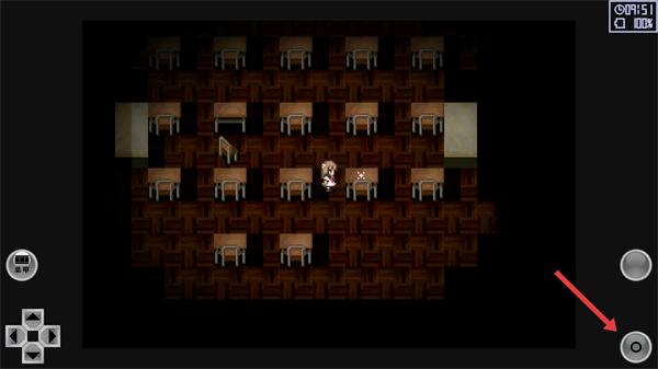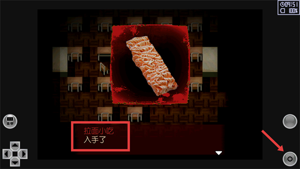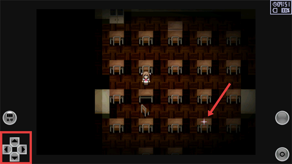 1、使用左下角的方向键操控角色移动,前往红色箭头指向的发光区域,探索并寻找道具或线索。