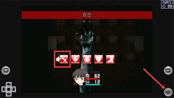 4、遇到敌人进入战斗界面时,点击红色框内的攻击按钮,选择合适的攻击方式与敌人战斗,点击右下角圆形按钮确认操作。