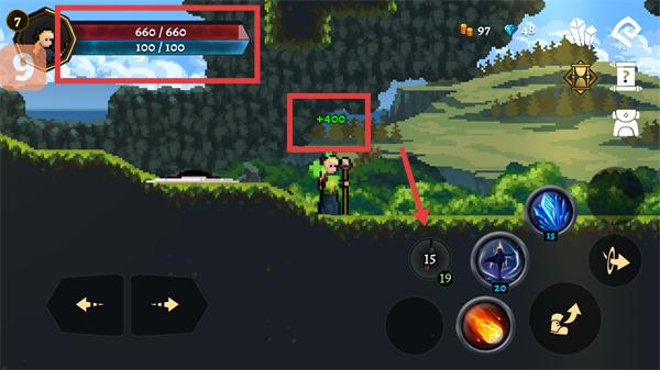 1、角色等级达【7】级,血量回满至【660/660】,击败敌人后获得【+400】奖励,准备切换场景。