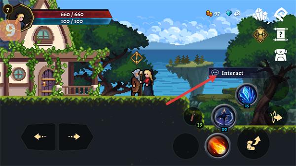 4、移动至房屋旁,点击【Interact】按钮与NPC交互,触发剧情或获取任务,推进游戏流程。
