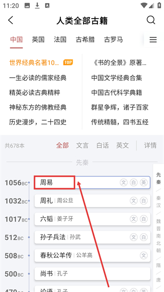 2、在人类全部古籍页面,定位到【周易】条目并点击,可进入该古籍的详情界面查看相关信息。