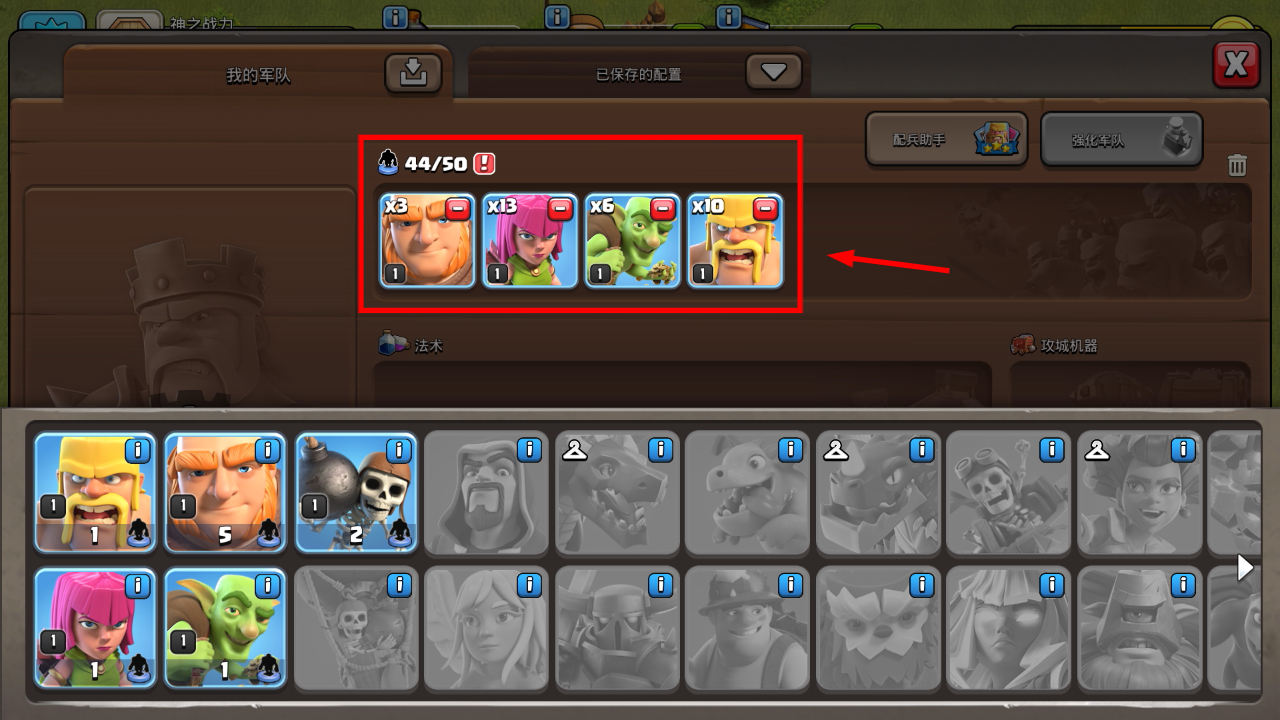 2、配置军队时要确保【弓箭手】数量达【15个】,可减【巨人】或【哥布林】数量来腾空间满足任务要求。