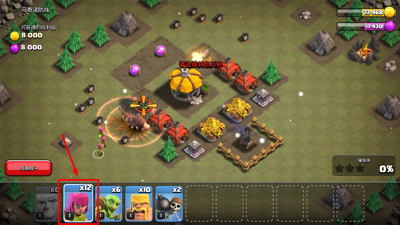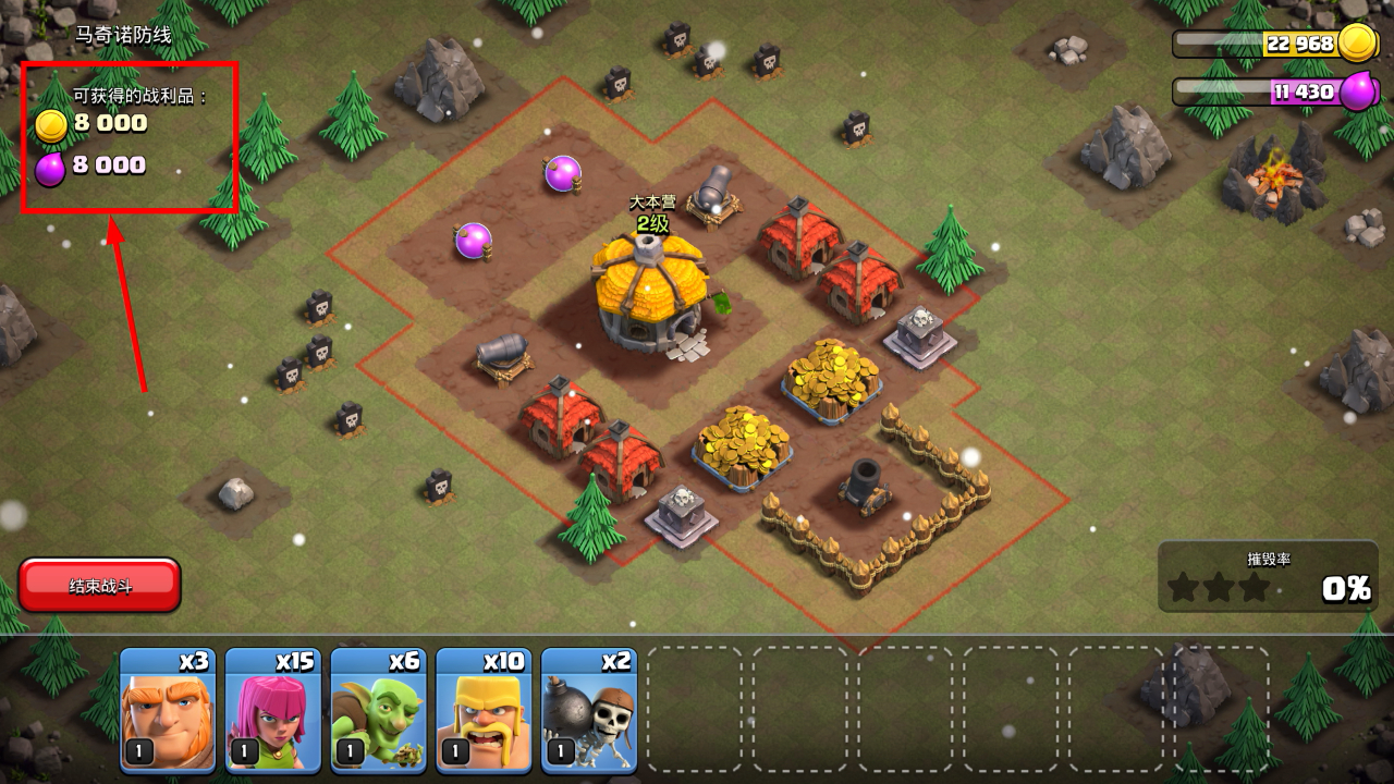 3、战斗优先攻击敌方资源建筑与防御设施,获取【8000】金币和【8000】圣水,同时推进胜利星进度。