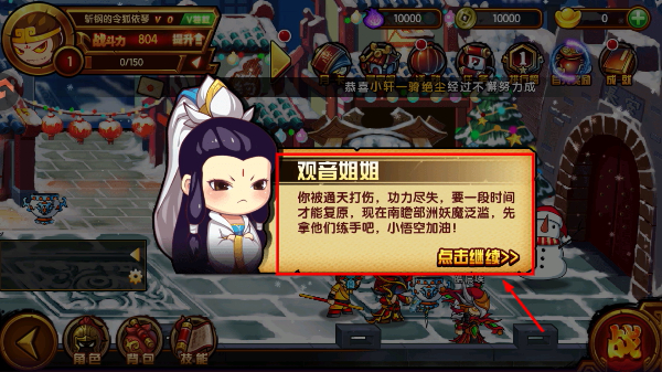 2、按指引点【点击继续】,进入降魔洞副本,击败妖怪练手以提升初期的战斗能力。