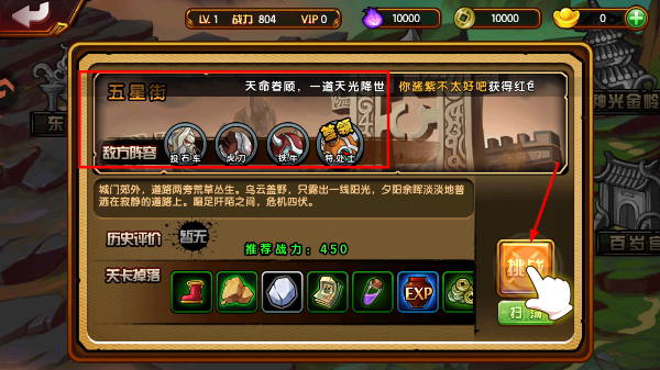 4、查看五星街的敌方阵容配置,点击【挑战】按钮,完成关卡可获取红石神光金岭等奖励。