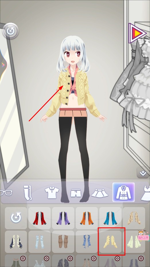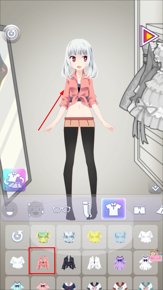 3、切换到上衣分类,挑选粉色上衣,搭配已穿的黑色长袜,丰富造型。