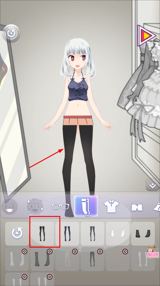 2、在服饰栏选黑色长袜,为角色穿上,打造基础穿搭风格。