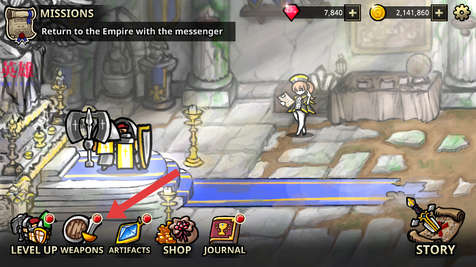 1、在主界面点击红色箭头指向的【WEAPONS】选项,可利用无限资源提升装备属性。