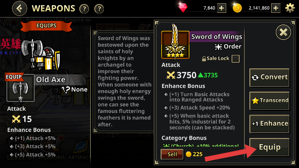 2、进入武器界面后,选择强力武器如“SwordofWings”,点击红色箭头指向的【Equip】按钮装备,借助无限资源强化战力。