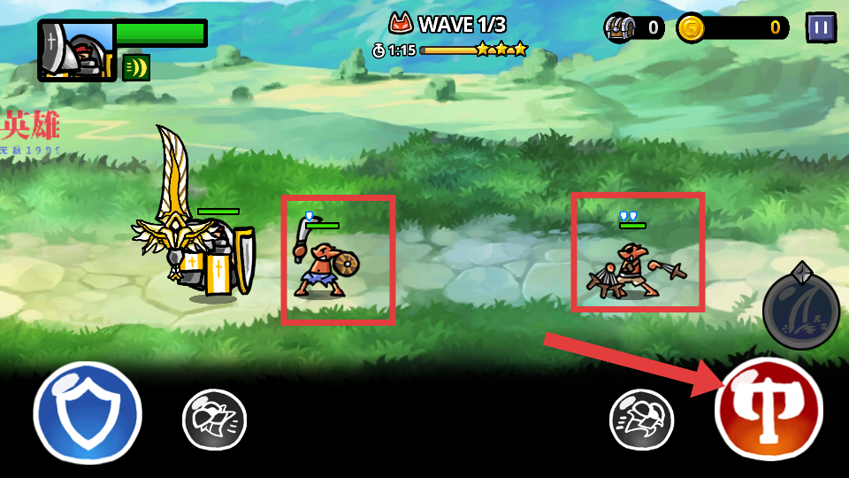 3、战斗中,面对红色方框内的敌人,点击红色箭头指向的技能按钮发起攻击,高效消灭敌人。
