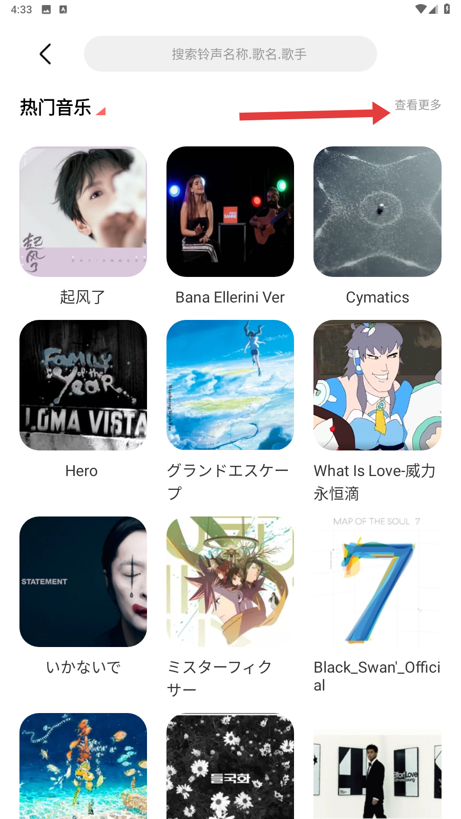 2、在热门音乐界面,继续点击【查看更多】,就能看到更多音乐选项哦。