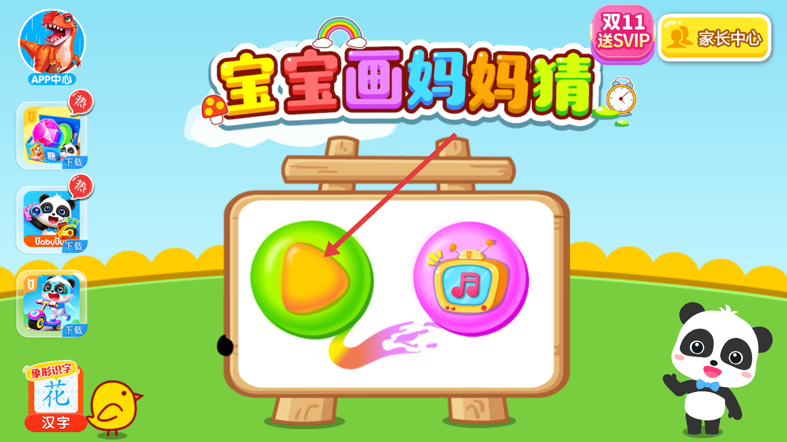 1、点击绿色圆形中的黄色三角形按钮,进入【宝宝画妈妈猜】游戏。