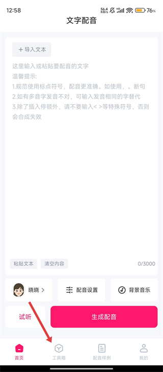 1、打开配音大师,在【文字配音】页点击底部【工具箱】进入工具页面呢。