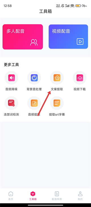2、在【工具箱】页找到【文案提取】功能,点击进入对应页面呀。