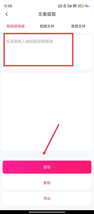 3、在【文案提取】页选【短视频链接】标签,粘贴链接后点【提取】哦。