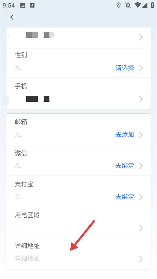3、找到【详细地址】选项,点击进入地址填写页面。