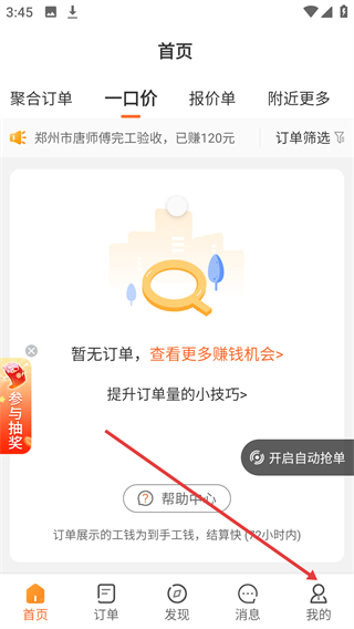 5、来到首页,这里可以查看系统为你推送的订单,然后点击底部我的。