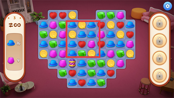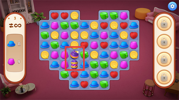 2、观察棋盘上的蓝色帽子、粉色杯子等物品,选择相同物品进行消除。