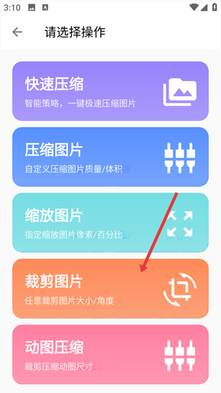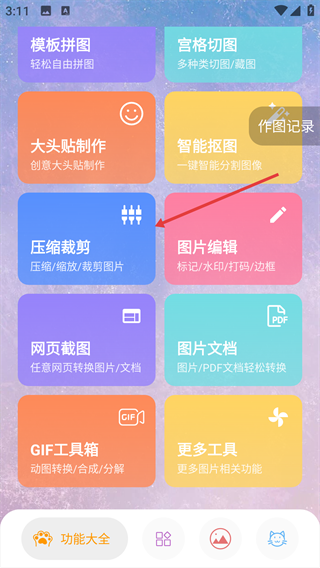 1、在“功能大全”页面,点击“压缩裁剪”选项。