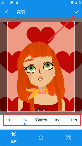 4、选择所需的裁剪比例,调整裁剪区域后,点击右上角的确认按钮,完成图片裁剪操作。
