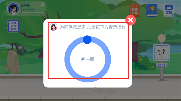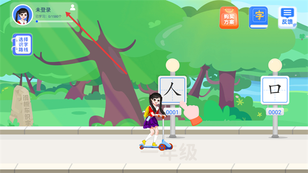 1、打开滑板车识字应用,点击左上角“未登录”区域,触发登录验证弹窗。