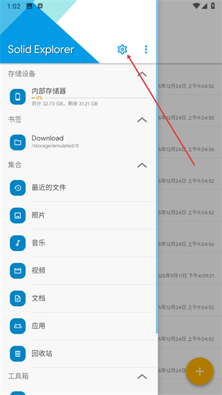2、在侧边栏菜单中找到设置选项,点击该选项进入Solid Explorer的设置页面。
