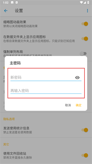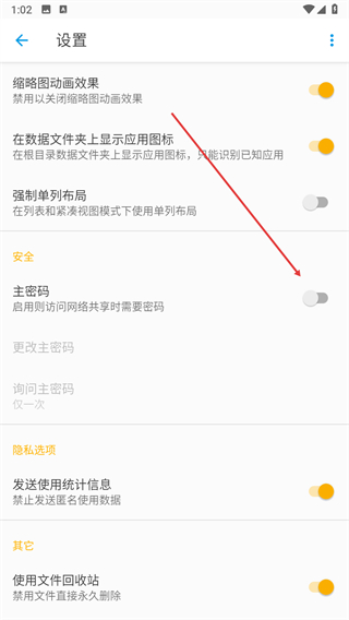 3、在设置页面的安全分类里找到主密码选项,点击对应开关弹出主密码设置窗口。