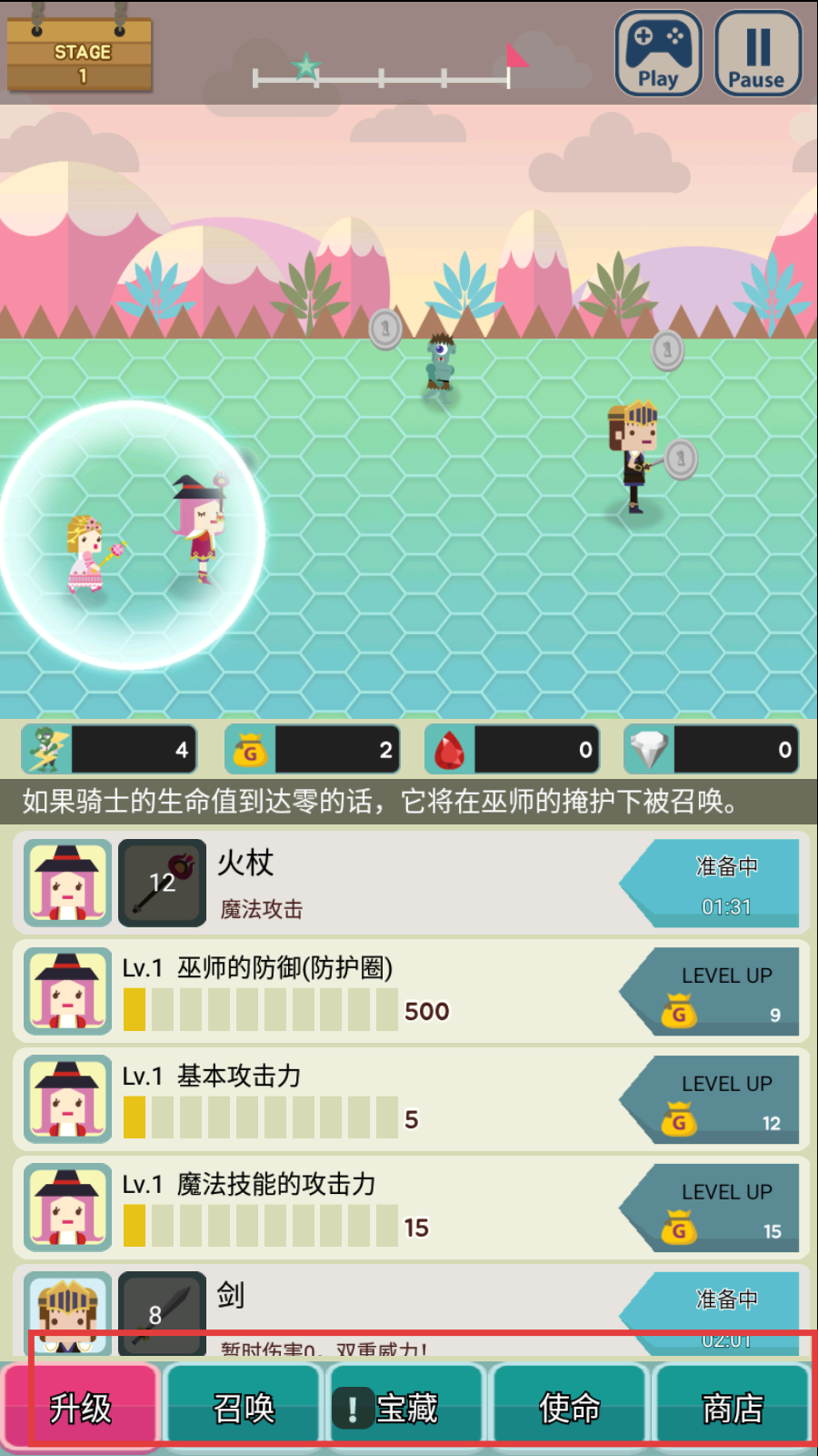 2、利用下方【升级】【召唤】等功能按钮,提升角色能力,助力战斗。