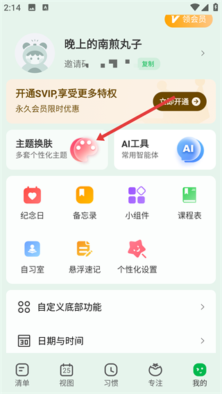 2、在个人功能页面,选择“主题换肤”选项。