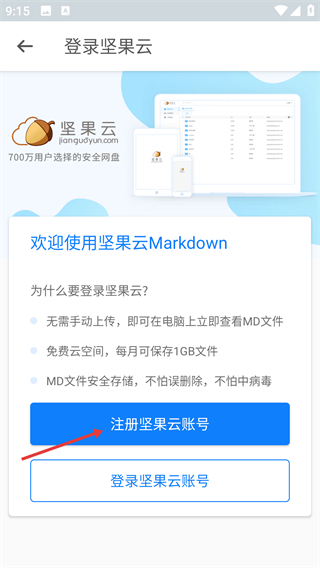 1、打开坚果云Markdown应用,点击底部【坚果云】选项,进入登录/注册页面。
