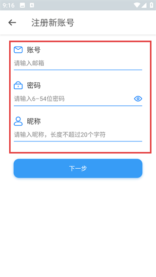 3、在注册界面依次输入【邮箱(作为账号)】【密码(6-54位)】【昵称(不超20字符)】。