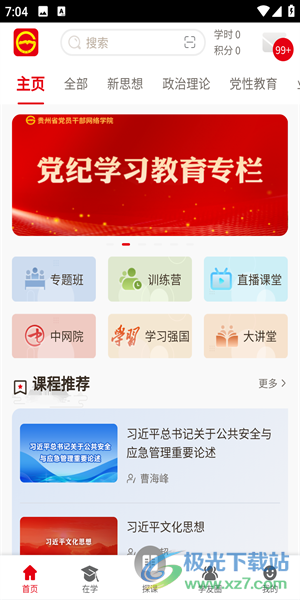1、下载软件之后可以看见这样的界面,这里有课程推荐,可以看见关于习近平总书记的诉说与思想。
