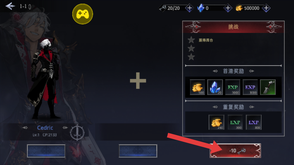 1、在关卡选择界面,确认角色Cedric的属性后,消耗钥匙进入1-1关卡。