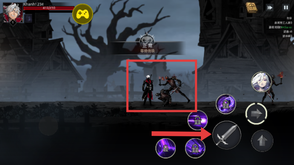 3、遇到敌人时,点击右侧剑形攻击按钮发起攻击,消灭持火把的敌人。