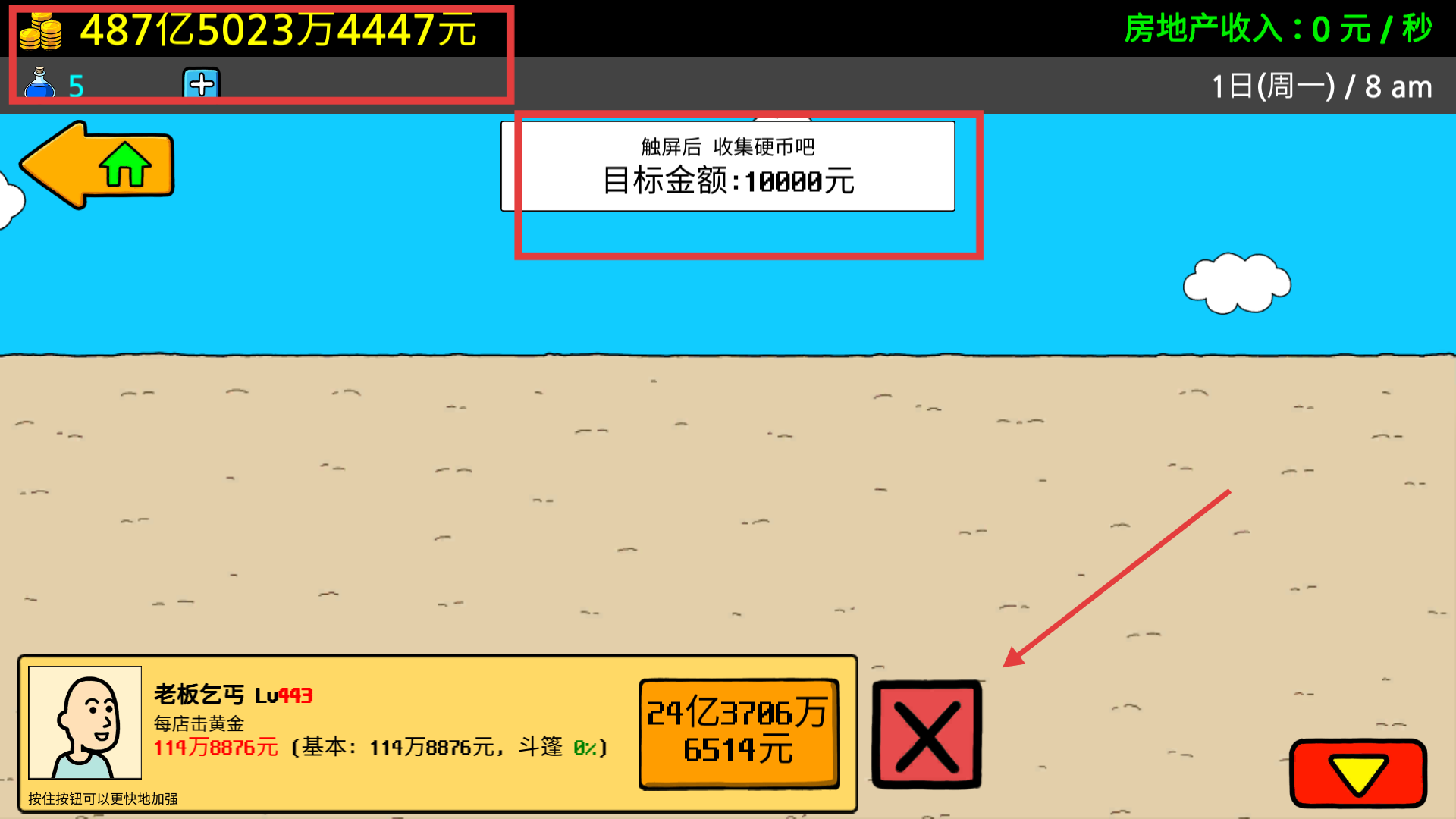 1、触屏收集硬币,目标金额10000元,通过点击积累资金,同时关注当前拥有的资产,为后续经营做准备。
